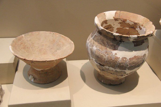 上山文化红陶豆、陶平底罐,嵊州小黄山遗址出土。