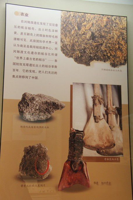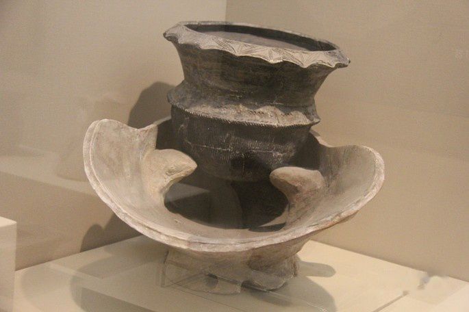 河姆渡文化十八角芽叶纹肩脊陶釜、陶灶,余姚河姆渡遗址出土。