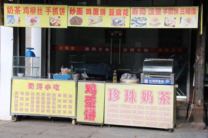 南浔小吃店,品种繁多。诸如鸡蛋饼、铁板炒面、脆皮鸡柳、特色豆腐花、三味臭豆腐、香酥炸鸡排、香辣炸牛排、澳洲大肉串、里脊肉串、台湾热狗,以及奶茶、手抓饼、寿司、三明治、台湾烤香肠等,中西兼顾。
