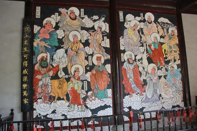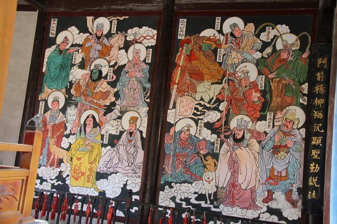 南方七天神,西方七天神。有联云:门前杨柳犹记显圣勤说法,世上众生可得成渠乐万家。