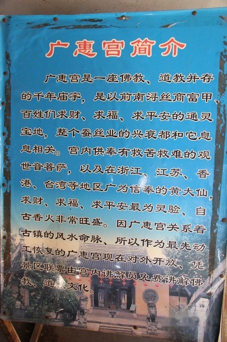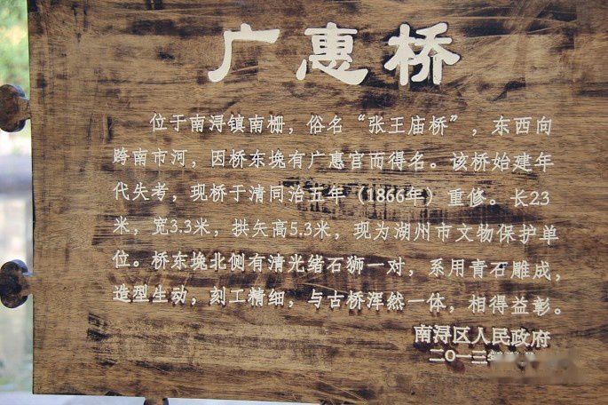 始建于北宋治平年间(公元1065-1068年)的广惠宫,迄今已有940多年的历史,建观历史长于南浔建镇历史。殿内祀奉道教最高神“三清”神像,始称广惠宫。后因元末农民起义领袖张士诚曾在此修粮仓,占广惠宫为行宫,俗称张王庙。广惠宫历经沧桑,曾三毁三建。2003年南浔古镇保护性开发工程将重建广惠宫列入规划,并着手动工兴建,基本恢复广惠宫原貌。