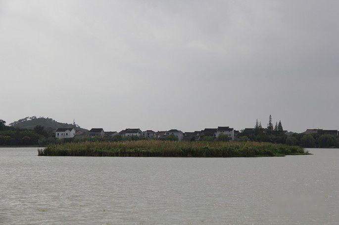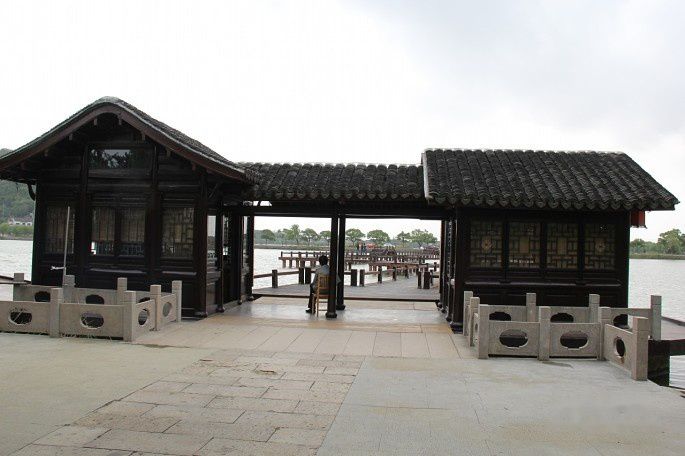 小岛上环境优美,仿古的亭台楼阁自然融入其中。