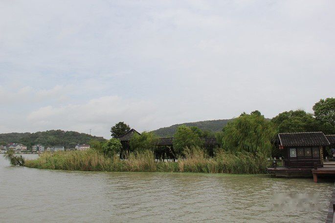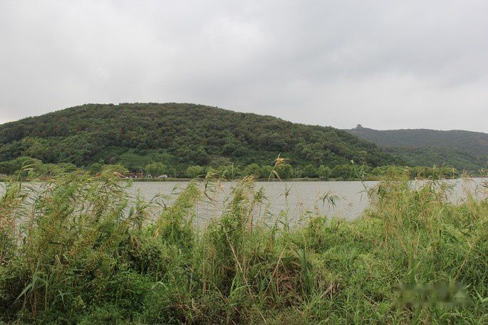 近处芦苇风中摇曳,远山顶上的白云阁隐约可见。