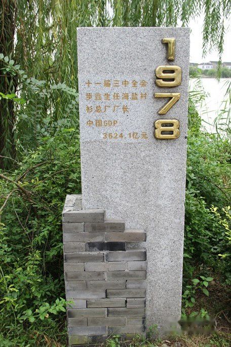 步道两侧以立碑的形式记录了我国改革开放以来的重要年份。1978年改革开放开始-步鑫生任海盐衬衫总厂厂长,这一年中国GDP为3624.1亿元。