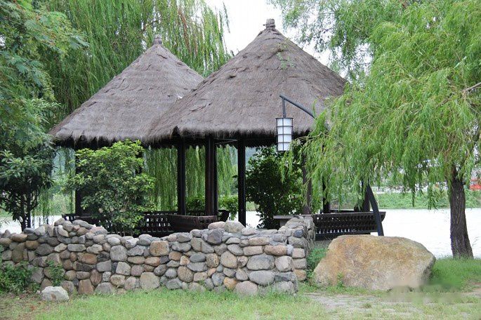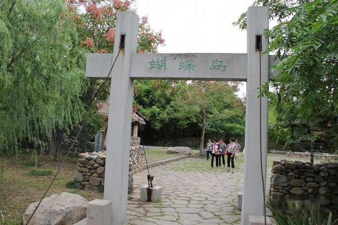 然后坐上车子顺着湖边转到南湖的蝴蝶岛,沿途有不少果园和农家乐饭庄。蝶来亭。