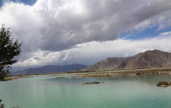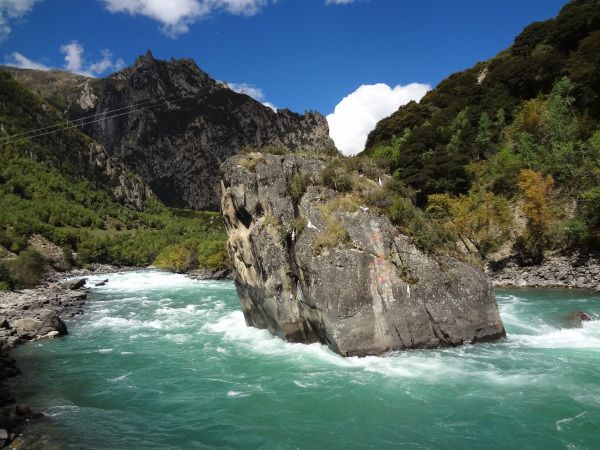林芝地区号称小江南,是一点也不假,在拉萨的山,基本是秃山,植被很少,越往林芝方向走,山上就逐渐的长出植被,从巴掌厚的一层低矮植物到林芝地区的茂密的森林,一路的自然风光很是养眼。说林芝像小江南,是因为他有山有水,山水相间,尤其在有的地方,是浅浅的河滩、河水碧绿的有如绿松石,加之散落其间的叶子金黄的树木(这种树的树冠像是松塔下圆上尖,有亭亭玉立的感觉),在蓝天白云和明媚的阳光映衬下,就是世外桃源。