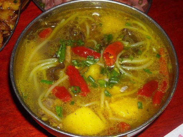这个红呼呼的东西叫做扎西德勒,其实就是胡萝卜西红柿烧牛肉,上面飘着一群奶皮子。。。