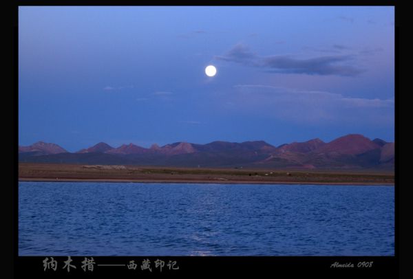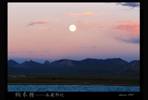 此时,西边的红日,东边的白月同在,天地一点点地氲染成金黄色,水面上晃满了碎金般的光芒。我向着前方的皓月走去,我走,它也走,路再长,也无法让我走近。左转、上坡,纳木措在我的背后渐渐淡去,直至消失——