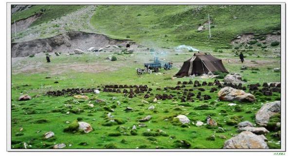 离开羊八井,车子不再停靠,直奔纳木错。路上难得一见的见到了藏民的毡房,看到毡房前面摆放的什么没?正在晾晒的牛粪。呵,漂亮吧,不要鲜花插在上面,一样是风景。