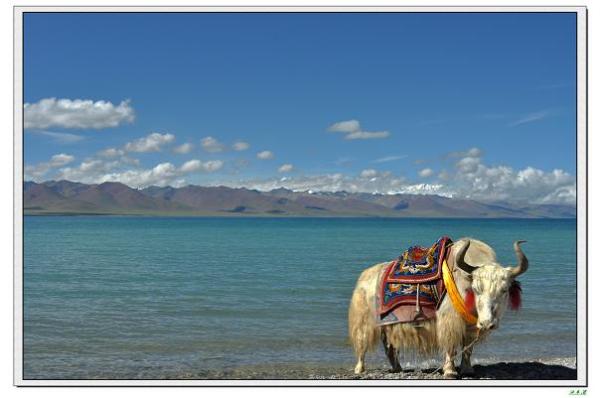 念青唐古拉山主峰、圣洁的白牦牛与纳木错碧蓝闪亮的湖水一起组成了一幅凝止的圣图。网络、书籍、驴友给了纳木错太多的描绘与赞叹,让我们对它有了太多的期待与想象,现在奔波一天只能赏其小小的一个角落,我和老美女都略感单调与失落。