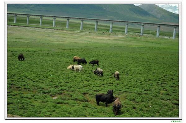再回首,铁路桥下安详着吃草的牛群,与青藏铁路那么自然一体。