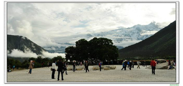 进了景区,统一乘坐景区里的观光车。第一个停车点就是观看南迦巴瓦整体效果最美的地点。我不知道该怎么形容站在南边巴瓦面前的感觉,那一瞬,眼睛在睁大,心也在睁大,它离我们那样近,似乎能感受到它的呼吸,但又离我们那样远,神圣而不可触及,云与山相依,山与地一体。