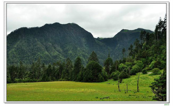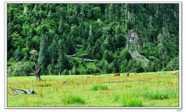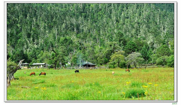 珞巴族村庄往上就到了天边牧场。怎么说呢?观光车上所有的女游客在见到牧场时,都是欢呼着跳下的车。远处山峦的黛青,近处树木的深绿,眼前牧场的黄绿,还有点点的小花摇曳在其中,色彩丰富,而情境悠远。我问导游为什么牧场上不见有牛羊吃草呢?原来这里看似牧场,实则为湿地(沼泽地),牛羊上去会陷下的。