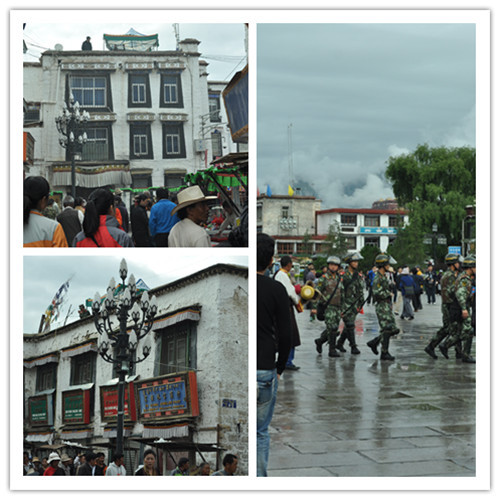 八廓街实际呈U形,在每一个转弯处抬头,总能在转角处的屋顶看到一个个身着迷彩服的身影,行走在八廓街宽大的石板路上,也总有列队的解放军战士佩戴着装备进行巡逻。初见,乍眼;再见,却觉得藏民对他们的存在并没有入眼;或许,这也是一种融汇。