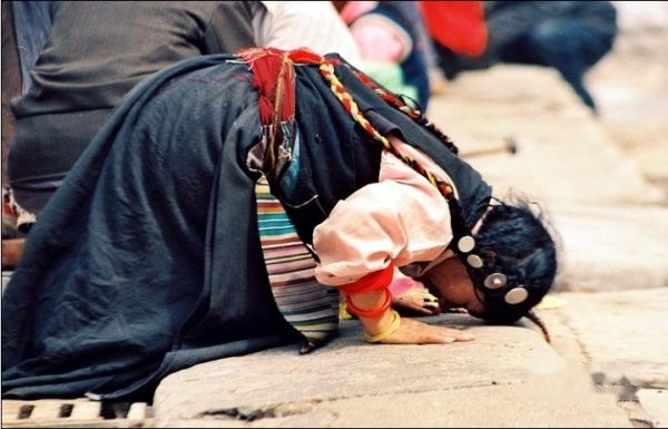 在拉萨的林廓东路边,我们在吃着早餐。在人来车往的街道上,我们亲眼见到一男一女两名藏胞一前一后地磕着长头。他们双手合掌高举过头,然后降至鼻尖,胸口,身体迅速前扑,双臂前伸平放在地上划一记号,全身匍匐,然后起身,跨前两三步到记号处,再重复以上动作。由于前额及鼻尖贴了地,所以其上都有灰土沾成的圆点。他们的藏袍外套着一件帆布长围裙,双手垫着木板。他们一丝不苟,任凭时尚和现代的东西在身边一闪而过,他们的心不为之动,信仰不为之变,我行我素。据说他们中许多人还是从四川、青海、甘肃等地一步一个长头磕到拉萨,历时往往一年或几年,不辞风霜,不辞千里,不惜抛家弃产,沿途乞讨也要到拉萨,所以在拉萨乞讨的人很多。他们往往因朝拜而抛其所有,最后除了信仰便身无分文。这些乞讨的人总令我们敬佩,他们是精神的富者。在八廓街大昭寺前,我们也见到无数磕长头的人和乞讨的信徒。我不想对他们说长道短地评论,但他们的虔诚确实令我感动无言。我心灵所受的悸动,也许并不亚于1818年,白人探险家第一次发现在北极冰雪世界里竟有顽强生活着的爱斯基摩人时的震惊。在这难得真诚、信仰早已支离破碎的后工业时代,我终于看见这世上还有如此纯粹靠信仰而活的人。他们用自己的身体,一寸寸地丈量着通往终极的无穷路。