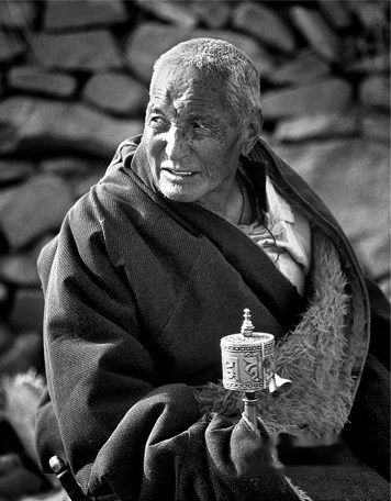 在西藏,人人口中念念有词。他们都在念诵六字真言。整个西藏变成了一个“六字真言”的嘛呢世界。人们走到哪里,都手摇嘛呢筒,转嘛呢轮,绕嘛呢石堆(又名玛尼堆),诵嘛呢咒。就像十九世纪一英国学者所描述的:“在西藏的每个十字路口,每走一步,都有某种形式的六字真言在注视着旅行者”。也许每个西藏的孩子自呱呱坠地时,便在父母的嗡嗡嘛呢声中逐渐学会了唱诵真言,至老也念着六字真言坦然离世。绝大多数的藏民,从早到晚,从生到死,一举一动,无不与他们的宗教和信仰有关。他们的家里大多有一个小佛堂或小小的神龛台,还有酥油灯、哈达,香和八宝吉祥物等供献品,供家人早晚叩拜祈祷。不论男女老少,出门人均配戴“格马”或“松科”等护身符,手不离念珠。念珠都有108颗珠子,不念时绕在左手腕上。西藏宗教节日很多,人们在节日里既娱神也娱人娱己。在藏民眼里,神灵无所不在,每座山每条江每片湖每棵树甚至每个人身上,都有可供朝拜的种种神灵。神山圣湖,寺院古迹,都是朝圣的对象。在民间,有些牧民见佛就拜,见塔就转。在西藏,人们心甘情愿地供养着喇嘛。喇嘛如同汉语里的“和尚”,藏语意即“上人”。人们相信喇嘛是引导他们进入佛道的唯一导师。子女出生要请喇嘛命名,男女婚嫁须请喇嘛占卜,患病要喇嘛医治,人死后要喇嘛念经。在藏传佛教的西藏,喇嘛无论是宁玛派(红教)、噶举派(白教)、萨迦派(花教)、格鲁派(黄教),还是本教(黑教)的,都很受普通藏民的尊敬。难怪藏俗语有说:“日月高于山巅,喇嘛高于国王。”在西藏我们遇见无数身披袈裟,面带微笑的喇嘛,其中有一位年逾花甲、须发皆白、慈眉善目的喇嘛,他满面红光,身体健硕,见我们上了车,便主动牵扶我们,一直微笑,欲言又止,我们用眼神笑态交流着一切。我仿佛觉得眼前的他本身就像一尊佛。西藏就是这样,全民信教,人皆好佛。宗教世俗化,世俗宗教化。在藏传佛教影响下,民风纯朴无邪。河畔路边的东西放几天也无人偷,寺院黄金万两也无人盗。他们怕报应、积善果、戒五毒。他们对信仰的虔诚不二,常令我们这些俗人惭愧不及。他们在这世界上最恶劣的自然条件和生存环境中,仍对自然感恩戴德,用他们的宗教信仰支撑着整个人生。
