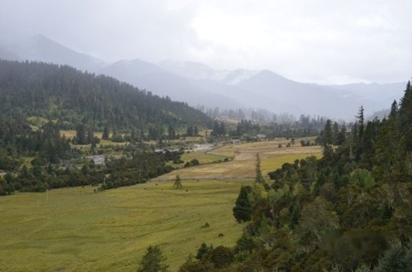 这是一片典型的高原山地草甸狭长地带。两侧青山由低往高分别由灌木丛和茂密的云杉、松树组成的林海。