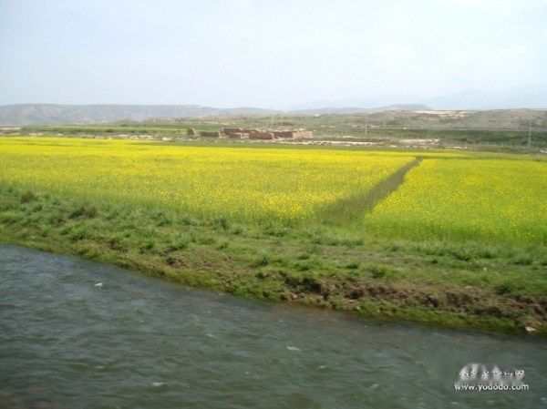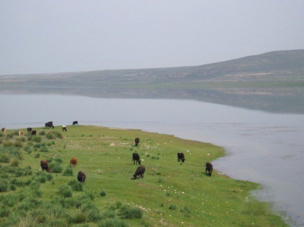 8:40AM,车子准时出发,缓慢的行驶在西宁市中心,几位乘客陆续上车,说着我们听不懂的方言。西宁市并不华丽,没有挺拔的高楼大厦,十分朴实,城市节奏比较缓慢,市民优闲的生活着似的。道路沿着湟水延伸,车窗外的景色很快转变成了农村田野风光。湟水孕育的土地上种着不同的作物,玉米、青稞、油菜花一片一片的从眼前扫过,还经过一片紫色不知名植物的耕田,就想像它是薰衣草吧。湟水弯弯曲曲流着,若距若离出现在我们的眼前。车子离开城镇越远,我们的视野也开阔起來,高山、溪流、山壁上的北禅寺、放牧在青青草原上的牛羊,都是一幅幅美丽的油画。经过一个很大的湖面,以为到了青海湖,后來查了一下地图,原來是东大滩水库。东大滩水库的风景美极了,水库边有青青的草原,草原上有人在放牧牛羊,好一幅具有诗意的田园诗画。