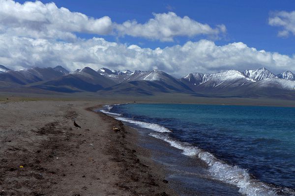 附图10:纳木错蓝天、白云、雪山、湖水与中华秋沙鸭