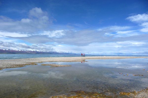 高原的气候真是瞬息万变 我刚到山顶就下起雨来,眼前一片片、一串串的风马旗在风雨中飘荡摇曳,婀娜多姿;山脚下四周连绵不断的湖水无边无际,与灰蒙蒙的天浑然一体;远处念青唐古拉山雪峰忽隐忽现,与纳木措山水相依。雨越下越大,越下越急,我一路小跑着下山,不知什么时候雨就没啦。回到朋友中,我们结伴向纳木措另一方向的湖边走去。