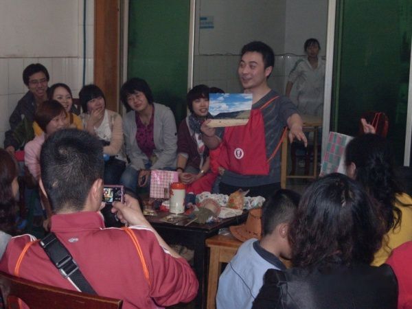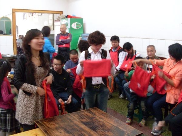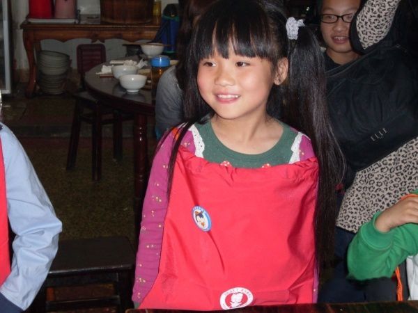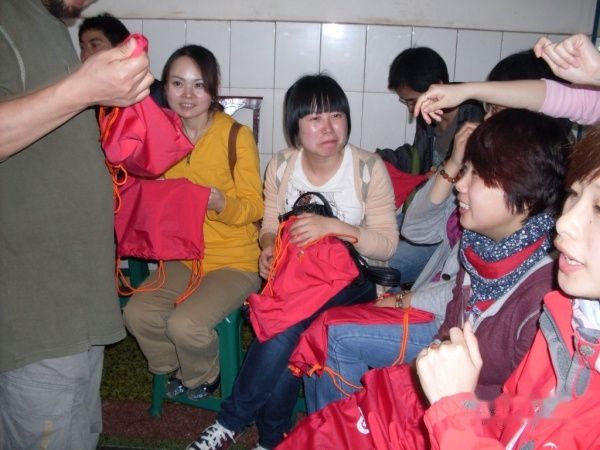 吃好了,下午时间大家围坐在发了天下民宿网站给多多友们寄来的周年礼物——一个防水的背包。包包很可爱,大家都很高兴,说像红肚兜,于是我们都围在前面。