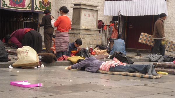下午和小四在大昭寺晒太阳,大概是爬布宫累了,晒着就睡着了。然后一个导游带着一群游客过来介绍大昭寺,还跟我们打招呼说你们怎么跑到这儿来了?原来是上次去药王山买2块钱门票说给我们打9折的那个售票大叔。