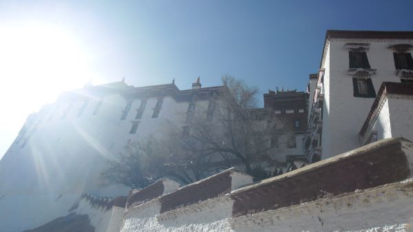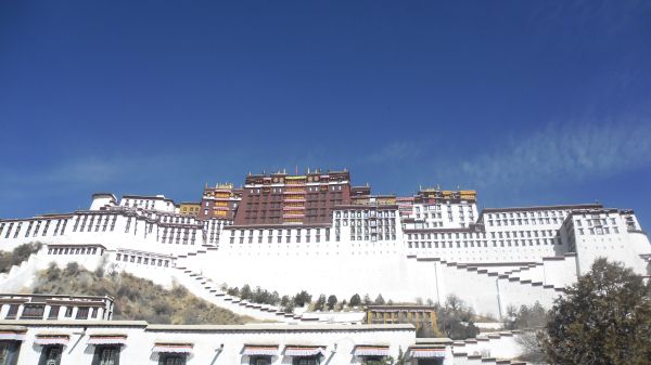 早上约了小四一起去布宫。半个多月来第一次起那么早。公车都还没有。我直接步行到布宫了。结果小四已经在半山腰的售票处等我了。我急得跑上去,结果一口气喘不上来,差点歇菜了。高原地区,不能跑啊,不然有你受的,我缓了好久才过来。温度很低,冷得手连相机快门都按不下了,但是天气太好了,是大半个月来,在拉萨看到的最最美丽的蓝天,天得像一块布,给人一种PS过的感觉。不拍照太对不起这蓝天了,结果拍到相机没电了。