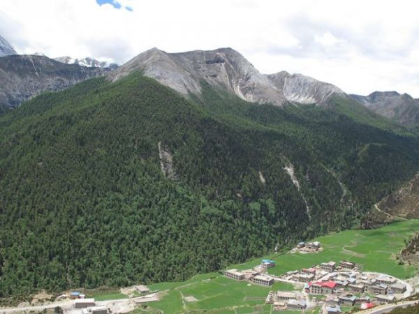 在离稻城县还有18公里的时候,看见1个标示牌,名曰:桑堆红草地,司机师傅让我们在外面看看就行了,没必要进去,因为里面的草地还没红。进入稻城县后感觉温度并没有传说中那么低,也没有下雪,只是在途中翻阅1个叫高尔寺山的时候有下冰雹,在稻城我们住的是青杨林山庄,据说是根据稻城的青杨林景区来命名的,外观好漂亮的,纯藏式风格。里面除了房间小了点。还蛮干净的。热水也很大,全程住宿应该是我住得最好的地方吧。用过晚餐后,他们都成双结对的出去溜达了,而我一个人在大厅整理行李,因为得准备进入亚丁的东西,遇上2个骑单车过来的骑行者,待他们整理好行囊,我们一起来到酒店门口的河边上,交谈中才知道他们都是在网上约伴过来的。1个是山东的,1个是武汉的,成都出发已经骑了7天了。敢问自己是否也敢如此,答案否,不由得佩服这样的厉害劲儿,这样的坚强,两个骑行者比我大2岁,在他们年轻的心态面前,我终于发现自己变老了。我想这是任何女生都不愿意承认的事实。问他们的目的,得到的答案让我思索很久,“人生在世不称意太多,生活中的困难远比骑行者的困难高很多,一切只为快乐。仅为骑行者的快乐”。仅有佩服可言哪。