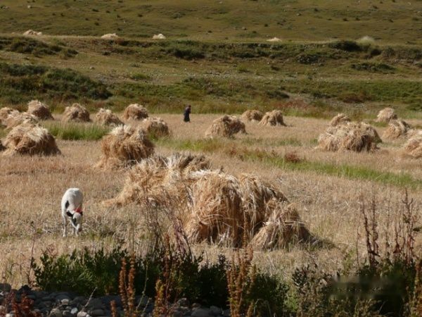 在已收割的青稞麦地里有一位藏民和一头小羊。