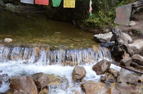 沟内古树参天,山清水秀。奔腾的溪水上方架着独木桥。