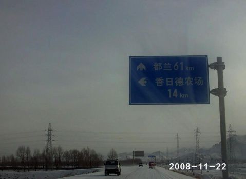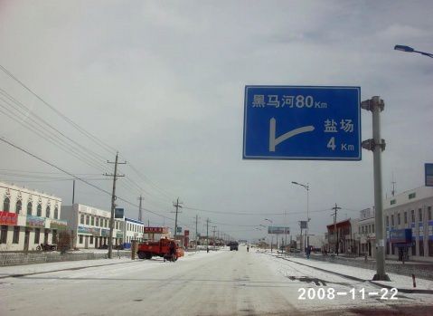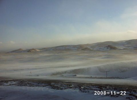 过了这片眼前的盐碱草滩地后,在平坦的公路上开始出现了白色,空中也出现了柳絮似的小雪花。愈来愈白,愈来愈大,白色又成了今天的主色!