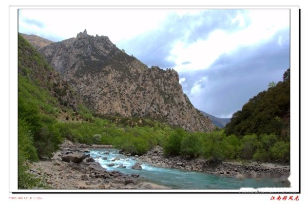 大约1点左右,我们到达途中的必须经过的一个景点“中流砥柱”,是免费的。西藏到处都是好景色,像这样的免费景点还有很多。只见一巨石兀然立于湍急的尼洋河中,那巨石背靠神佛山,像一枚带纽的印章,有一幢房子般大小。河水冲击巨石,溅起浪花,翻滚激荡夺路而去。两岸山势险俊,“印章”上还长着松树,被多种植被装点。巴桑说:“藏民认为这块巨石是工尊德姆修炼时的座椅(藏民奉工尊德姆为工布江达地区的守护神),是神物。每逢吉日很多藏民都会来这儿朝拜,这地方有灵气。”