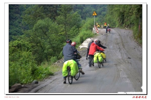 大约9点左右,瑞风转过一个弯道后,原本平整柏油路不见了,眼前是狭窄泥泞不堪的土石路。巴桑急忙关掉了车载CD说:“通麦天险到了。”我们的心不由紧张起来,只见左侧傍山,右侧是汹涌奔腾的帕隆藏布江,江水的颜色在此段也变的浑浊。瑞风转过一个山角在拐弯的陡坡处突然刹住。抬头见一辆货车正向我们驶来,前面的路只能容一辆车通过。此时,巴桑急打喇叭提醒对方,并叫我们下车帮忙照应倒车避让。倒车时由于泥路湿滑,右后轮压在了崖边险些悬了空,幸好巴桑手急眼快及时稳住了车身。好危险呐!这刚进通麦就来了个下马威,把我们吓出了冷汗。