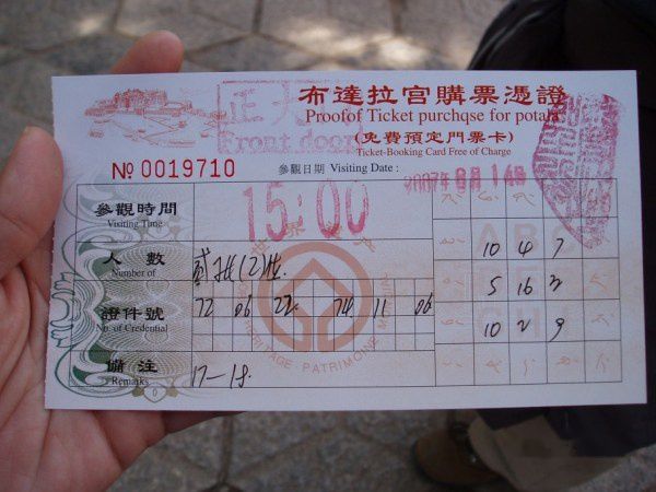 我们领到的布达拉宫购票证印着3点入场,我们提早一个小时到了布达拉宫宫墙正门,出示了购票证,守卫的验票程序很严谨,必须核对身分证、护照等有効证件。