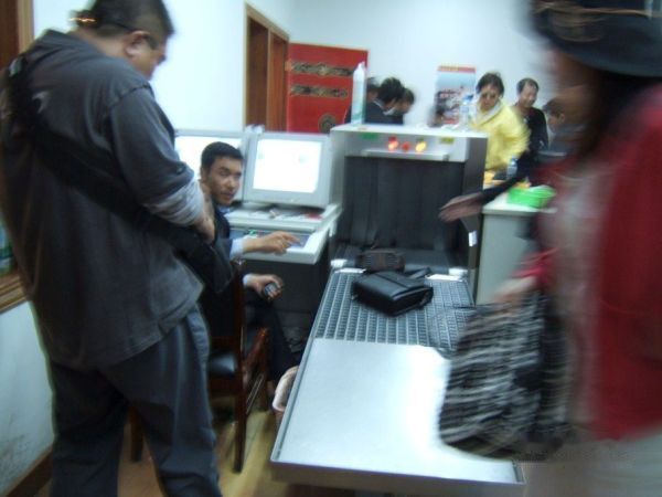 进入大门,转左,来到了一个类似机场出入境处或海关出入境处的检查站,把金属仪器如相机等放入一蓝子,背包放在输送带经过透视检查,游客则经过金属探测门检查。所有的火柴、香烟、打火机都在这里被没收,因为布宫木制结构很多,杜绝一切可能引起火患的违禁品。