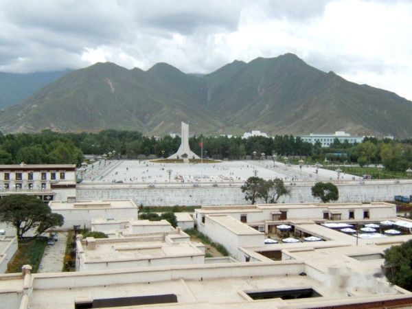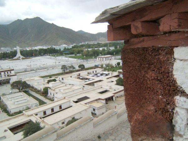 站在阶梯往下看,雪城及布达拉宫前面的广场一目了然。注意看雪城一间间房子的屋顶,布宫宫殿上的屋顶,也是用这种藏语叫作"阿尔嘎"的坚硬土铺成,这样的设计能使屋子结构的力度平衡,压力适度,即便遇到地震、风灾等自然灾害,城墙、屋顶也不易倒塌。