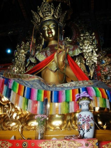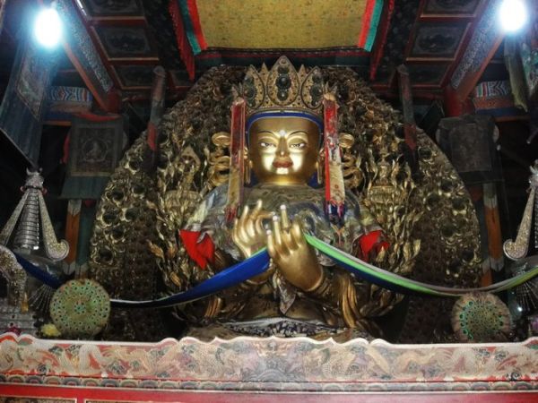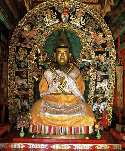 (1) 殿内供着1588年建造的宗喀巴镏金铜像,带有背光的宝座,高达数米,头戴黄帽,别具风格,神态慈祥壮严,栩栩如生。背光上装饰着精美的佛教故事图和木雕“海怪”、狮子、鹏、飞天、花卉等浮雕。