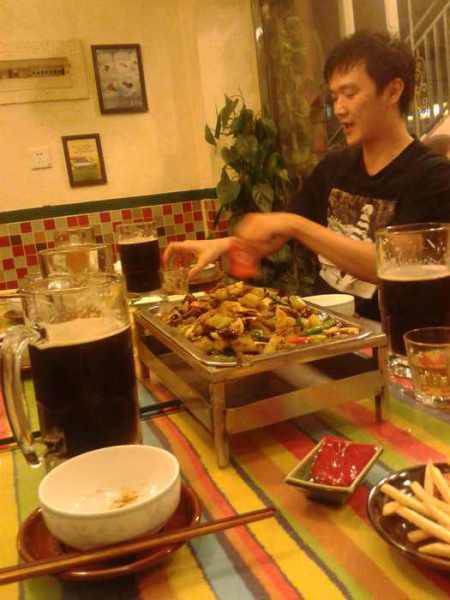 行完街后到了一条食街食了一个较贵的夜宵。大杯洒(黑啤),大块肉,还有红红的辣椒!