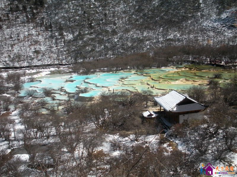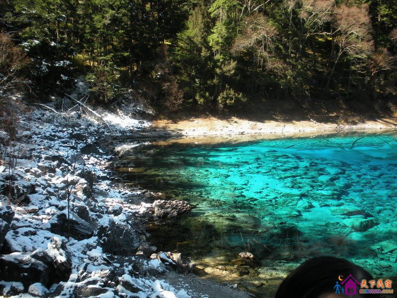 去到箭竹海,阳光渐渐进入深陷山中的九寨,开始能看到它丰富的美丽色彩,淡蓝的天空、雪白的云片和雪层、棕红、艳黄、深绿、翠绿、嫩绿的各色植物,一切如同油画。阳光照到雪粒上时更会反射出耀眼光芒好像水晶散了一地,是连油画都无法表现的晶莹。这时候才能看清九寨沟的水清澈如纯净的宝石,带着或翠绿或亮蓝的艳丽色彩,凝聚成一大块天赐的瑰宝。
