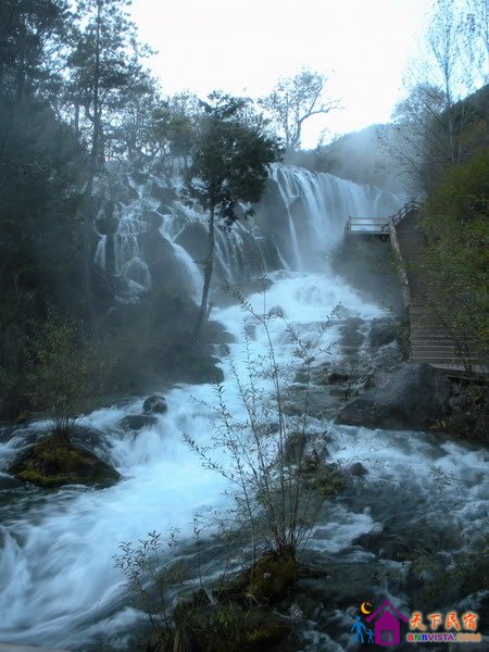 五花海之后有两个对比起前面的震撼而言有点平凡的海子,但后来看到说它最深处居然是全九寨最深的108米,愕然。再下一个景点是珍珠滩瀑布,经典版西游记片尾的拍摄地,多年前就有人发现这块宝地了啊。想把那个画面拍下来但相机太差从下方拍上去要不一片黑要不一片白,囧。