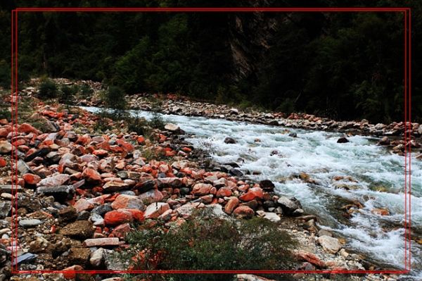 车辆经过一个小小的拱门,泽郎说,我们已经进入了牦牛谷天然盆景区,前面就是红石滩。不一会儿,眼前出现一大堆红色的岩石,在山泉和牦牛河水的冲刷下更加夺目,与青山绿水相映成趣。