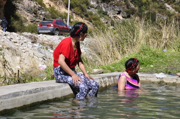 再前行数百米,天然温泉到了。前两天听朗吉描绘这温泉有多舒服,如今一见,颇有点失望。牦牛河岸边,有两个水泥池子,山间小溪和池边的股股热泉汇聚到池子里,便成为温泉。不过虽不好看但还中用,泉眼边的水非常烫,流到池中温度倒适中,脱下鞋袜,把双腿浸入池中,顿觉疲惫感消除了一半。九寨沟一站下来,小腿很是酸痛,泡在温泉里揉揉捏捏,舒服啊。当地的居民直接穿上薄衫薄裤,整个人浸在水中享受这天然的spa;还有两个小孙子,光着屁股,搀扶着爷爷来泡温泉,也许是认为可以驱除病痛吧。