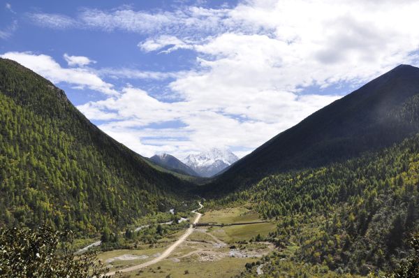 沿着山路上行,视野逐渐开阔。行至山顶处,听到一声惊呼,两座大山之间忽然高耸出一座雪山,这便是被广为称道的亚拉雪山吗?如今近在咫尺,像一个纯洁的小婴儿被大山母亲环抱着,静谧而安详。
