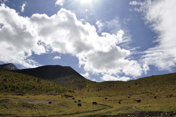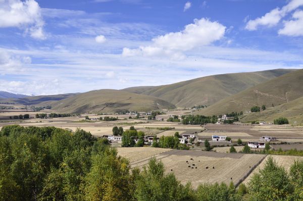 八美草原是气象万千的,山坡下分布着一些民居,人们开垦出田地,不仅放牧,还种植粮食、蔬菜,因此,在同一片蔚蓝的天空下,绿色、黄色、褐色的地块纵横交错,白色的房屋和黑色的牦牛星星点点,构成一幅和谐的画面。