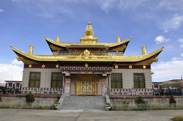 一直在大山中穿行,总也看不够这独特的草原美景,直到泽郎提醒:塔公寺到啦!塔公寺是一座金碧辉煌的寺庙,四周围着白墙,墙上立着白塔,更凸显寺庙的尊贵。这里俨然成了一个重要景点,寺庙外很多藏民牵着马匹租给游客骑,商业气息浓郁。花了10元门票进了寺庙,里面居然很冷清。一个丹巴女孩免费给我们当起了导游,她在附近的学校读高二,趁放假过来这边玩。走进塔公寺,正对着我们的是“宝塔生辉”四个大字的牌匾,前面放着香炉烛火,后面是一个藏式的屏风。绕过屏风,可见寺内供奉着十八罗汉的小像,千手千眼观音像,释迦摩尼大金像,最主要是两尊觉卧佛。据说当年文成公主进藏,走到塔公寺之处便不能前行,公主觉得是神明的旨意,便在此处建造塔公寺,供奉觉卧佛,而觉卧佛的真身则被带到拉萨被供奉起来。