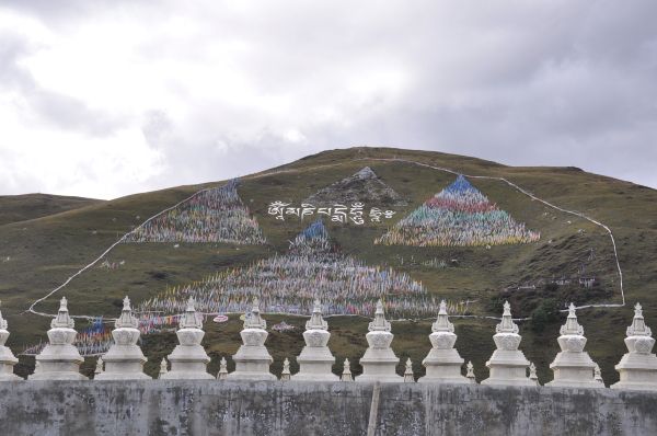 我们随着小女孩在大殿内转了一圈,回到门口牌匾处,点燃香火,祈求佛主保佑,继而走到转经筒前,一边默念祷告,一边转经,一共转完468个经筒,希望经筒转动的声音能带着我们的祈祷让神明听见。塔公寺对面的神山上插满了经幡,经幡上有各种各样的经文,人们把经幡摆成大小5个三角形,中间摆出藏文“哄玛尼贝贝哄”的字样,每当风吹动经幡,便把祷告带给神明,以祈求保佑。