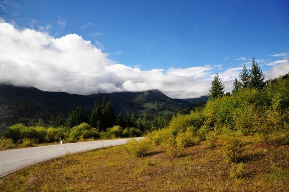 进入九寨沟沟口的九道弯让晕车的人叫苦不迭,我则卡西的跟着车左摇右摆欣赏着高原美丽风光,这8天里唯一有阳光的一段路,蓝天厚厚低低的白云三色山脉,我想一直一直这样。