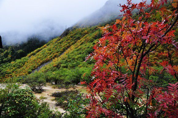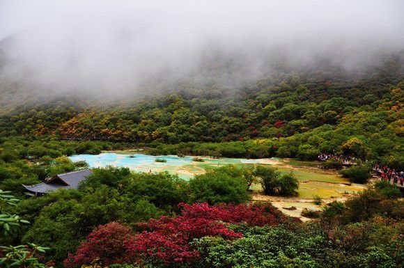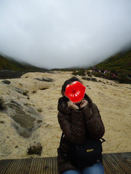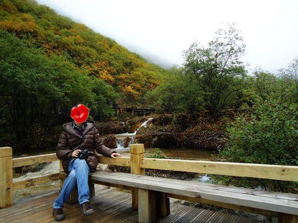 黄龙景区平均海拔3000多,上去就要3500多了。在五彩池附近买了杯热巧,15元,不让卖热水。黄龙真的超级凉,我们套上了防寒服,这也是八天里唯一一天需要穿防寒服的地方。黄龙此时的叶子已经有些红了,比九寨的好看多了。