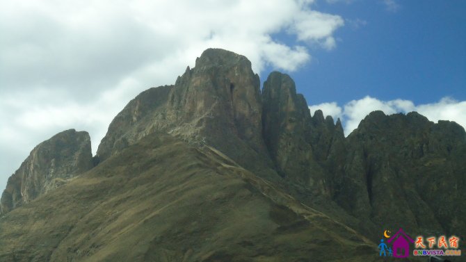 道旁树越来越多,越来越大,汽车也渐行渐慢,我以为快要到市区了。两边的山仍是一样的荒芜,只是离我更近了。岩石上画着白色的梯子,那大概是人们祈求灵魂登天的工具。偶尔绕过一个山坳,便出现几堆一米高的圆柱形的石堆,拉扯着一片片红布,旗帜一样在空中飞舞。山更清晰了,巨人一样挺拔,一块块肌肉,一根根肋骨,历历可见,他们就这样裸立在我眼前!
