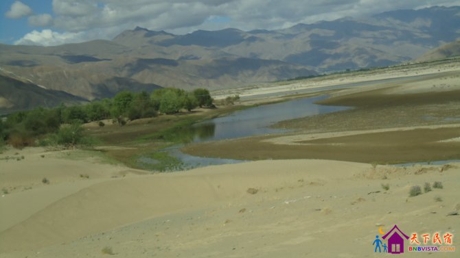 忽的,眼前一宽,一大片一大片沙滩晒在我们的窗前。不知名的高高低低的植物稀稀疏疏的散布在沙砾之间。一条淡蓝色缎子,带着我的目光,向远山和云间蜿蜒而去。客人淡淡的说,这就是雅鲁藏布江。我吃了一惊,谁曾想到,那咆哮着滚滚而去的世上最高的江,竟然在这里,在我眼前,一如一位婉约的处子,文弱又纤细,羞涩而镇定的款款西去,千百年来与群山为邻,同白云相依。